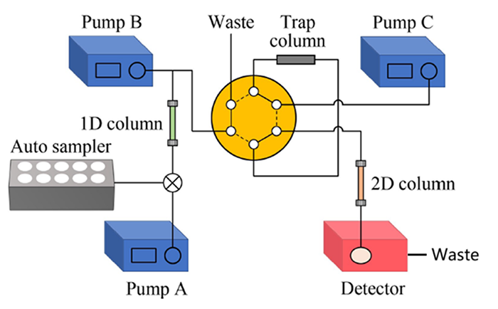 1、除雜質(zhì)過(guò)程:初始條件下,進(jìn)樣后A泵工作,切換閥處于實(shí)線通路,從第一維色譜柱(1D column)上洗脫的非待測(cè)組分通過(guò)切換閥排入廢液流路。