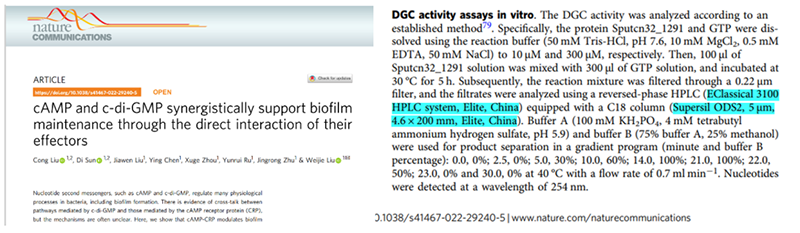 英國(guó)大綜合類(lèi)期刊Nature Communications,創(chuàng)刊于2010年,是首個(gè)冠名“Nature”品牌的純開(kāi)放獲取刊物,由英國(guó)Nature Publishing Group出版社出版發(fā)行。Nature Communications致力于發(fā)表生物、醫(yī)學(xué)、健康、物理、化學(xué)和地球科學(xué)等各領(lǐng)域的高質(zhì)量研究。據(jù)統(tǒng)計(jì)2022年該雜志的影響因子為14.91。該期刊在13期1493(2022)發(fā)表一篇《cAMP and c-di-GMP synergistically support biofilm maintenance through the direct interaction of their effectors》文章。該文章提供了在細(xì)菌中cAMP和c-di-GMP通路之間通過(guò)效應(yīng)物直接相互作用的證據(jù),并表明cAMP-CRP可以在翻譯后發(fā)揮調(diào)節(jié)作用。其中DGC體外活性測(cè)定中核苷酸檢測(cè)分析使用的就是依利特的EClassical系列液相色譜儀以及依利特Supersil系列色譜柱。