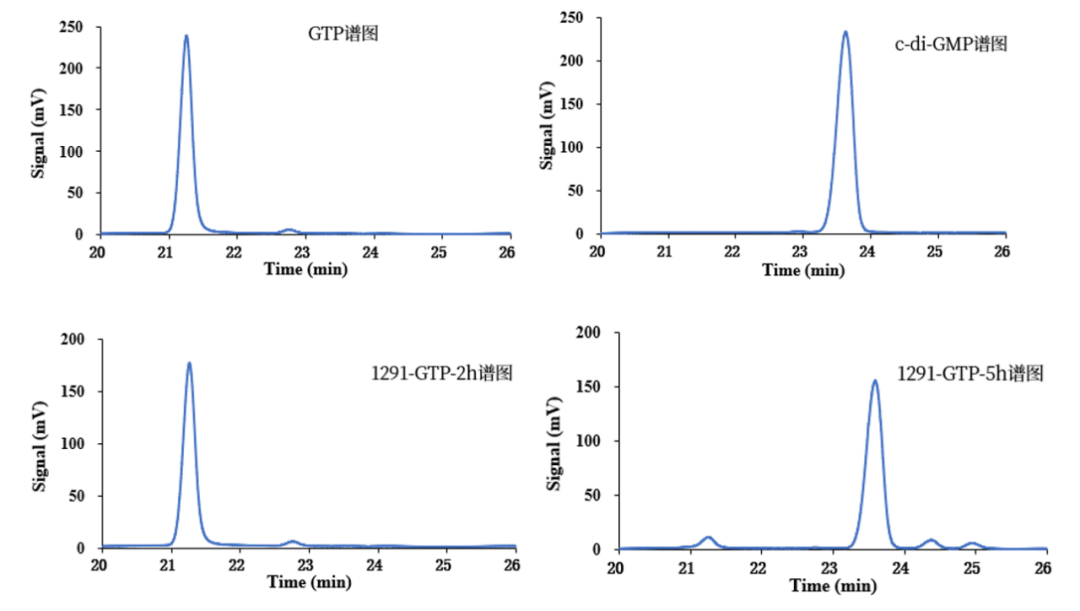 通過(guò)依利特EClassical 3100液相色譜儀搭配經(jīng)典Superisil ODS2色譜柱,對(duì)樣品中核苷酸進(jìn)行實(shí)時(shí)檢測(cè)。結(jié)果顯示,隨著時(shí)間的推移,樣品中的GTP逐漸轉(zhuǎn)化成了c-di-GMP,而GTP轉(zhuǎn)化成c-di-GMP的體外催化過(guò)程需要活性DGC的參與。因此,該實(shí)驗(yàn)表明:該樣品中含有活性DGC。