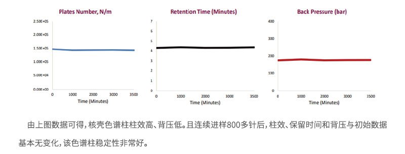 在相同的色譜條件下,核殼色譜柱可以超過大多數(shù)亞2μm多孔型色譜柱的柱效,且柱壓只有亞2μm多孔型色譜柱的一半。由于實心核的存在,樣品分子傳質(zhì)路徑短,極大的提高了分析速度。可以實現(xiàn)在常規(guī)HPLC上,獲得超高的柱效和更快的分離。