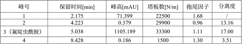 取25mg氟啶蟲酰胺樣品溶于50mL流動相中,超聲溶解后搖勻,用0.45μm的濾膜過濾后進樣。