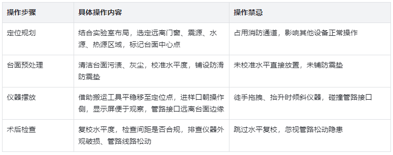 第四步,術(shù)后檢查。擺放完成后,再次用水平儀校準(zhǔn)儀器水平狀態(tài),檢查儀器與臺面、周圍設(shè)備的距離是否符合要求,確認(rèn)無遮擋、無擠壓;同時(shí)檢查儀器外觀是否有破損,管路、線路是否松動(dòng),確保放置后儀器處于安全待命狀態(tài)。