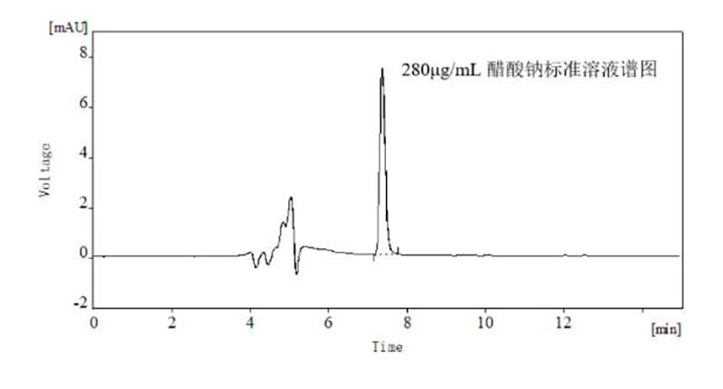 精準(zhǔn)稱取醋酸鈉25mg,精確至0.0001g,用水溶解,配制成1000μg/mL儲(chǔ)備液;并用水稀釋成120μg/mL、160μg/mL、200μg/mL、240μg/mL、280μg/mL的工作液。