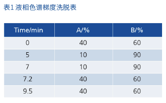 色譜柱:Quasar C18,100×2.1mm,3μm,貨號:N9308812(原文提及 “Supersil ODS2 2.1×100,3μm”,以實際檢測用 Quasar C18 柱為準(zhǔn));流動相:A 為 50% 甲醇水(含 0.5% 甲酸),B 為乙腈(含 0.5% 甲酸);柱溫:40℃;流速:0.5mL/min;進(jìn)樣量:10μL;