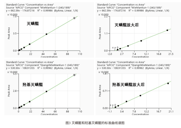 本文采用 EClassical 3200L-MS2 Vertical 9100 三重四極桿液質(zhì)聯(lián)用系統(tǒng),建立了快速、高靈敏度且可靠的 LC-MS/MS 方法,用于測定食品中滅螨醌和羥基滅螨醌,為該類化合物提供了高通量檢測手段,檢出限完全滿足相關(guān)標(biāo)準(zhǔn)要求。滅螨醌:y=530.50x-108.91355,R2=0.99962;羥基滅螨醌:線性方程及 R2 詳見完整譜圖,R2≥0.999)