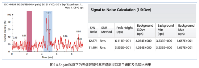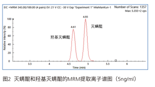 同時考察了該方法的儀器檢出限情況,在0.5ng/ml的濃度下,羥基滅螨醒和滅螨醒的的信噪比分別為11和12,如下圖所示,可見該方法靈敏度較高,完全滿足該標(biāo)準(zhǔn)的檢出要求。