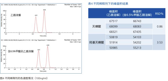對比乙腈與含 0.5% 甲酸的乙腈溶液作為稀釋劑時的標(biāo)準(zhǔn)品響應(yīng)(圖 4、表 4),結(jié)果顯示兩種稀釋劑對峰面積影響較?。珧?RSD=0.86%,羥基滅螨醌 RSD=3.53%),因此無需額外添加甲酸,兩種稀釋劑均可使用。