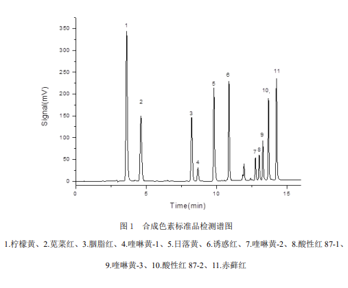 將樣品提取液和合成著色劑標(biāo)準(zhǔn)使用液分別注入高效液相色譜儀,根據(jù)保留時(shí)間定性,外標(biāo)峰面積法定量。