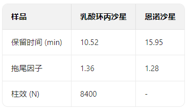 恩諾沙星保留時(shí)間 15.85min,拖尾因子 1.26,柱效(N)達(dá) 8500,分離效果與重復(fù)性優(yōu)異。