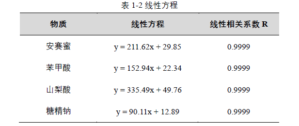 配制濃度分別為5μg/mL、10μg/mL、20μg/mL、30μg/mL、40μg/mL、50μg/mL、100μg/mL的標準工作液,按濃度由低至高進樣,以標準品濃度為橫坐標,峰面積為縱坐標,繪制校準曲線,安賽蜜、山梨酸、糖精鈉混合標準品的線性相關(guān)性結(jié)果如下。