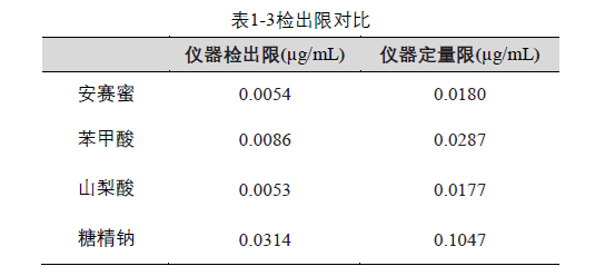 噪聲按0.01mV計算,峰高為3倍信噪比對應(yīng)的濃度為儀器檢出限,10倍信噪比對應(yīng)的濃度為儀器定量限,結(jié)果如下表所示。
