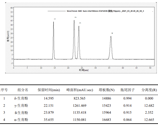 維生素 E 標(biāo)準(zhǔn)儲(chǔ)備溶液(1.000mg/mL):分別準(zhǔn)確稱取 α- 生育酚、β- 生育酚、γ- 生育酚和 δ- 生育酚各 50.0mg,用無水乙醇溶解后,轉(zhuǎn)移入 50mL 容量瓶中,定容至刻度,此溶液濃度約為 1.00mg/mL。將溶液轉(zhuǎn)移至棕色試劑瓶中,密封后在 - 20℃下避光保存,有效期 6 個(gè)月。