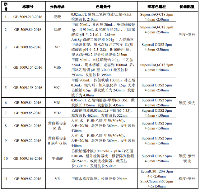 4.2 食品中常見分析物質(zhì)的色譜柱推薦及儀器配置 ........................... 15
