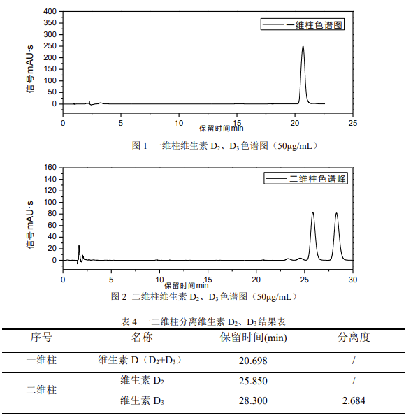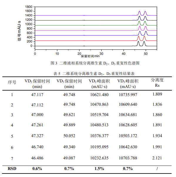 根據(jù)以上實驗數(shù)據(jù),Kromstation 色譜數(shù)據(jù)工作站可以實現(xiàn)對 EClassical 3200L 二維系統(tǒng)的全反控。根據(jù) GB 5009.296-2023《食品安全國家標(biāo)準(zhǔn) 食品中維生素 D 的測定》第二法:在線柱切換 - 反相液相色譜法(二維液相色譜法)分離維生素D_2、D_3,Kromstation 色譜數(shù)據(jù)工作站可以自動實現(xiàn)二維系統(tǒng)的閥切換完成維生素D_2、D_3的分離,且實驗結(jié)果具有良好的重復(fù)性和分離度,滿足對維生素 D 同分異構(gòu)體的分離檢測需求。