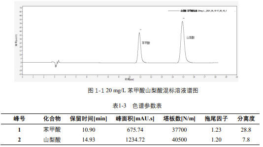 由表 1-4 可知,按照本解決方案提供的儀器及檢測方法進行分析,苯甲酸和山梨酸在 2-200mg/L 的濃度范圍內,線性良好,相關系數(shù)在 0.999 以上。