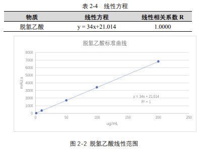 由表 2-4 可知,按照本解決方案提供的儀器及檢測方法進行分析,脫氫乙酸在 5-200μg/mL 的濃度范圍內,線性良好,相關系數(shù)達 1.0000。