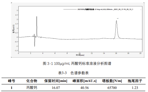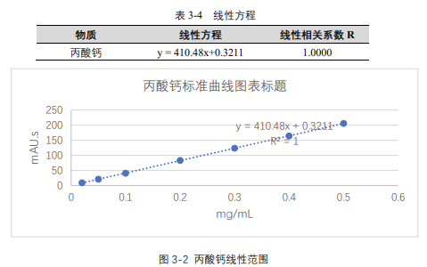 由表 3-4 可知,按照本解決方案提供的儀器及檢測方法進行分析,丙酸鈣在 20-500μg/mL 的濃度范圍內,線性良好,相關系數(shù)達 1.0000。
