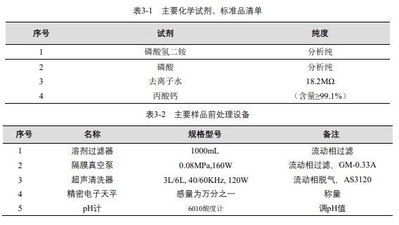 實驗過程中其它玻璃器皿還包括容量瓶 (100mL、50mL、25mL、10mL)、移液槍 (0~1000μL,0~5000μL)、移液槍槍頭 (1mL,5mL)、一次性 PVC 手套、一次性口罩、進樣針、濾膜等若干。