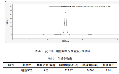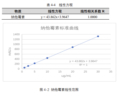 由表 4-4 可知,按照本解決方案提供的儀器及檢測方法進行分析,納他霉素在 1-30μg/mL 的濃度范圍內,線性良好,相關系數(shù)達 1.0000。