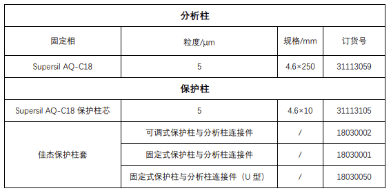 保護柱填料選擇的原則是好與分析柱填料保持一致,本解決方案中防腐劑的分析檢測使用的均是 Supersil AQ-C18 色譜柱,因此保護柱也應使用 Supersil AQ-C18 填料。該類型色譜柱及保護柱的訂貨信息如下: