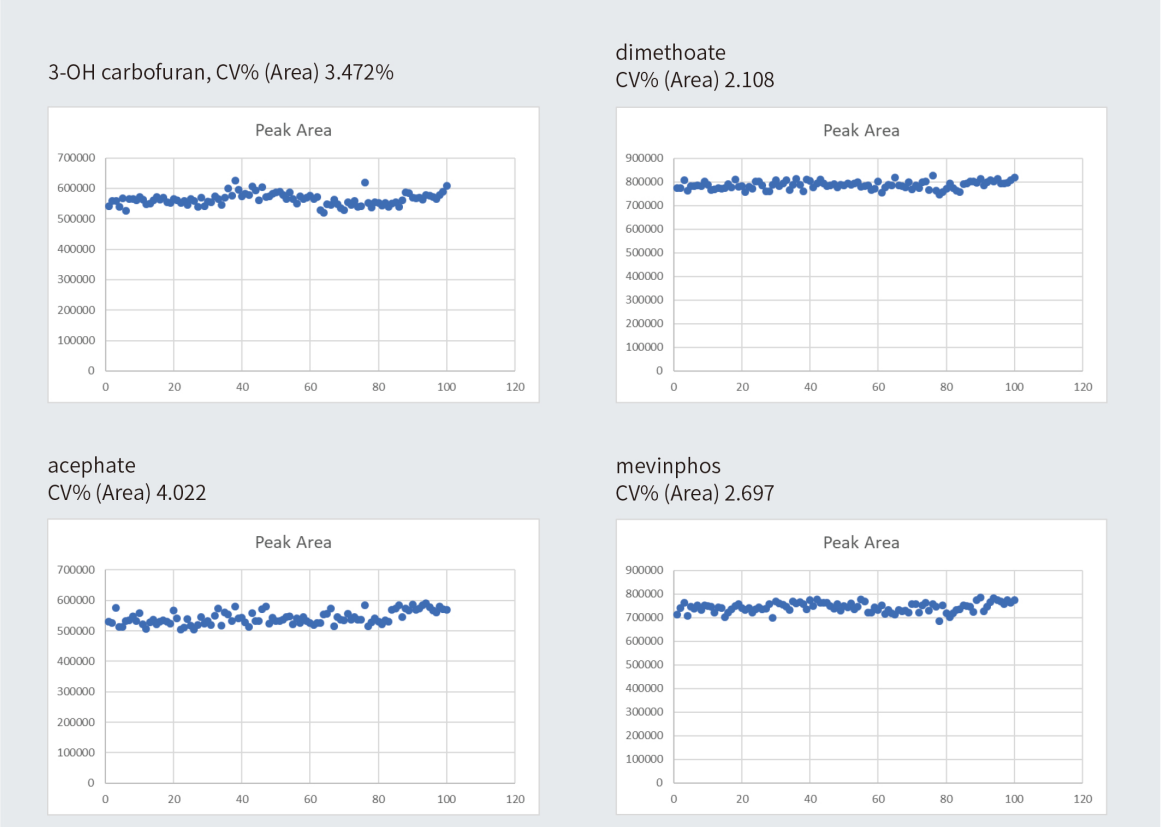 面對農(nóng)產(chǎn)品檢測越來越多樣和復(fù)雜的檢測樣品,三重四極桿質(zhì)譜的穩(wěn)定性和抗污染能力對于儀器的使用和維護(hù)來說也是非常重要的內(nèi)容。以待測樣品中常見而且非常復(fù)雜的茶葉基質(zhì)為例 (見圖 5),基質(zhì)加標(biāo)濃度 20ng/mL 連續(xù)進(jìn)樣 100 針,測試 MS2 Vertical9100 的耐臟性能。圖 6 展示了部分農(nóng)藥在 100 針進(jìn)樣條件下峰面積重現(xiàn)性均小于 5% 的良好數(shù)據(jù)。Elite MS2 Vertical 9100 系列三重四極桿質(zhì)譜具有獨特的 "不怕臟、臟不怕、怕不臟" 的硬件設(shè)計:1. 帶有反吹干燥氣的雙錐孔質(zhì)譜接口結(jié)合離子源主動排放廢氣泵設(shè)計,具有優(yōu)異的抗污染能力,長時間無需維護(hù)離子源;2.HSID 熱表面誘導(dǎo)去溶劑質(zhì)譜接口技術(shù),320° 加熱的質(zhì)譜接口使得儀器有效防止樣品中的復(fù)雜基質(zhì)污染儀器,長時間運行免于頻繁維護(hù);3. 層流氣離子導(dǎo)向技術(shù),提高離子傳輸效率避免頻繁的儀器調(diào)諧。優(yōu)異的耐臟基質(zhì)和污染物的硬件設(shè)計,保證滿足檢測靈敏度要求的同時,大程度使得儀器免于頻繁停機(jī)清洗和維護(hù),大大提高了儀器的利用效率。