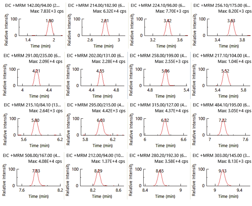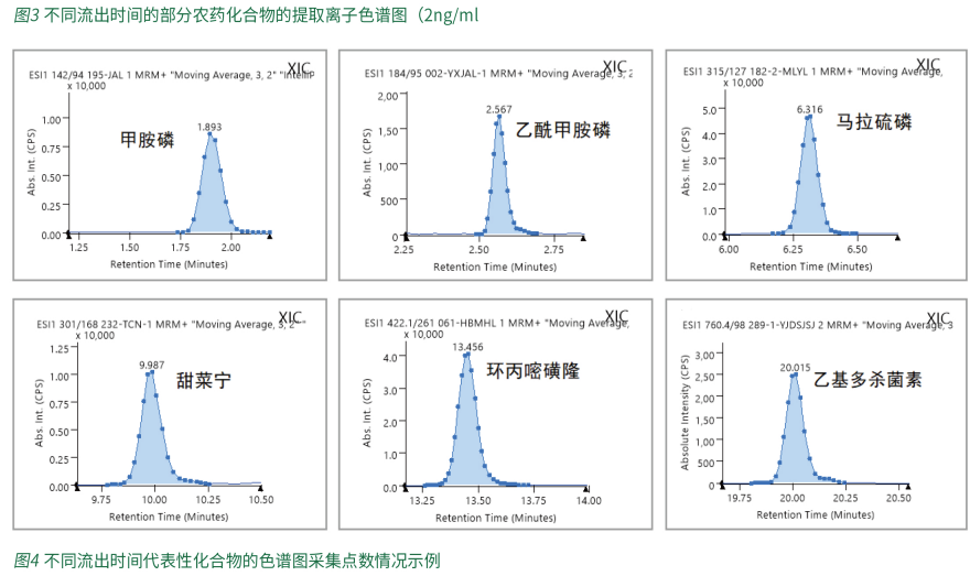 本方法采用一針進(jìn)樣,通過(guò)Time Managed MRM正負(fù)切換模式同時(shí)測(cè)定331種化合物及其45種代謝物,共375個(gè)化合物,其中365種化合物采用正離子模式采集,10種化合物采用負(fù)離子模式采集。圖1中展示了375種化合物的提取離子疊加譜圖,圖2中是單獨(dú)10個(gè)負(fù)離子化合物的提取離子色譜圖。經(jīng)過(guò)優(yōu)化色譜洗脫條件,圖3展示了不同保留時(shí)間的部分農(nóng)藥化合物的提取離子色譜圖。各個(gè)化合物峰型對(duì)稱,軟件中TimedMRM功能目動(dòng)完成375個(gè)化合物的軒留時(shí)間分配,保讓每個(gè)色語(yǔ)峰上有足夠的來(lái)集點(diǎn)教,以使獲得準(zhǔn)確的結(jié)果為優(yōu)異的重復(fù)性,不同流出時(shí)間的代表性化合物的色譜圖采集點(diǎn)數(shù)情況示例詳見圖4。