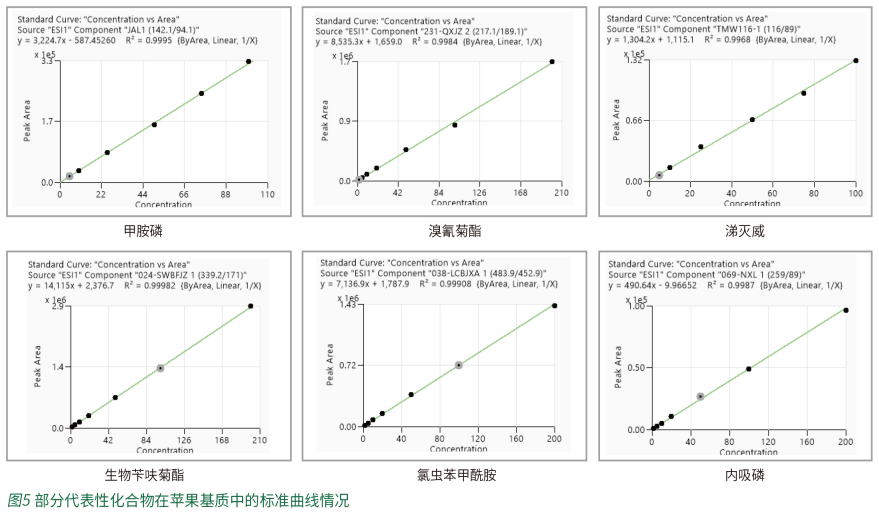 用以上3.1前處理步驟,處理陰性蘋果樣品作為空白基質(zhì),稀釋375種化合物的混合標(biāo)準(zhǔn)溶液,制成2ng/mL-200ng/mL的系列校準(zhǔn)標(biāo)準(zhǔn)溶液,并繪制標(biāo)準(zhǔn)曲線,采用外標(biāo)法進(jìn)行定量分析。圖5為隨機(jī)挑選的不同流出時(shí)間的化合物的標(biāo)準(zhǔn)曲線情況。其中全部化合物在線性范圍內(nèi),線性關(guān)系均較好,相關(guān)系數(shù)R2均大于0.995。