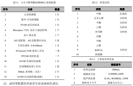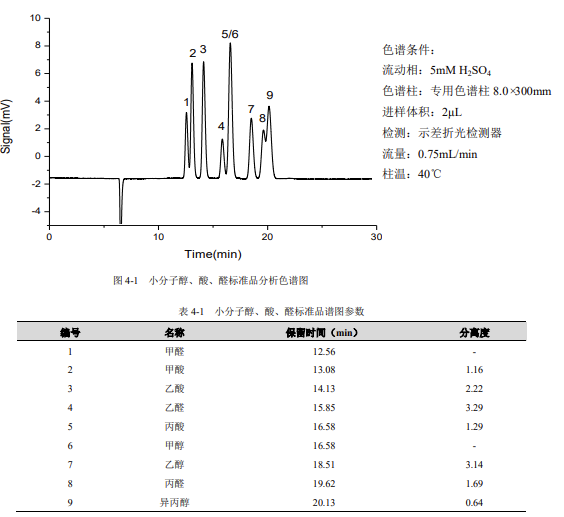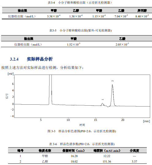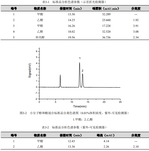 儀器設備與試劑示差折光檢測器為通用型檢測器,可以對所有小分子醇和酸進行檢測,但其靈敏度較低,不能用于痕量檢測;紫外可見檢測器對絕大多數(shù)在紫外-可見光的波長范圍內有特征吸收的物質均有較高的檢測靈敏度;兩種檢測器的串聯(lián)使用,取長補短,即能實現(xiàn)總量分析,又能完成對甲酸、乙酸等具有代表性的物質進行痕量分析的需求。