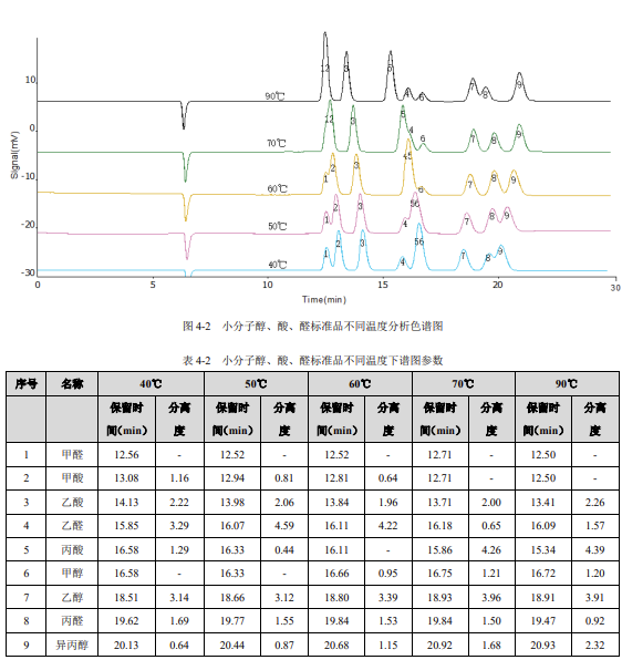 由以上結果可知,小分子醇、酸、醛的分離情況隨著溫度改變而改變,用戶可以根據(jù)自身檢測需求,選擇特定溫度進行實驗,從而達到測定某種或者某幾種小分子醇、酸、醛含量的目的。