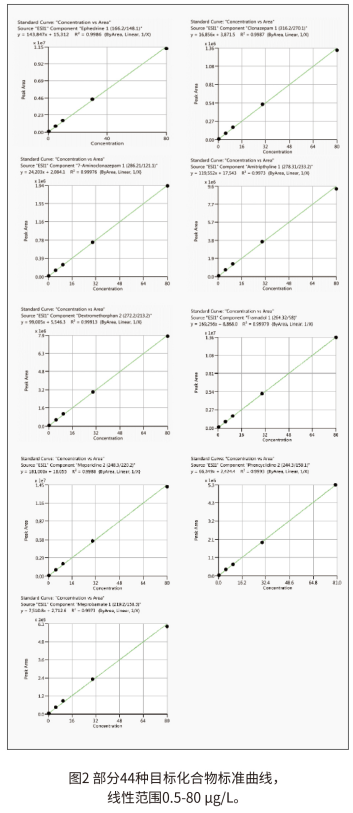 圖 1 中展示了采用目標(biāo)化合物濃度為 10.0μg/L 的提取離子色譜圖。各個(gè)化合物的峰型對(duì)稱,獲得優(yōu)異的色譜分離效果,僅需 4.5min 即可完成目標(biāo)化合物的分離,大大提高分析效率。