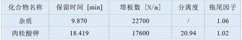 使用EClassical 3200液相色譜儀分析肉桂酸鉀粉末樣品,肉桂酸鉀目標峰峰形良好,柱效高,且雜質(zhì)分離度非常好,滿足定性定量分析的需求。