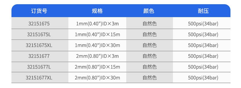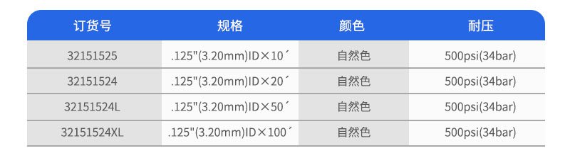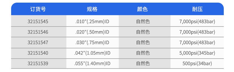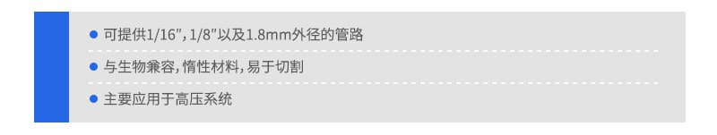 該種管有1/16"和1/8"外徑兩種規(guī)格,外徑和內(nèi)徑的公差分別為±0.001"和±0.003"。這種聚合物材料在100℃操作溫度下不會(huì)降低其機(jī)械強(qiáng)度。