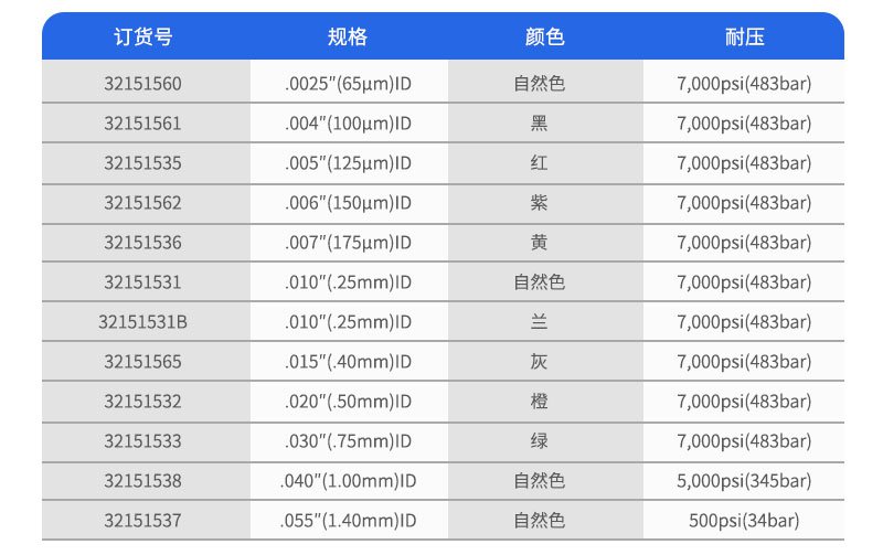 所有PEEK毛細(xì)管的內(nèi)徑和外徑的公差均在±0.0005"以內(nèi)。