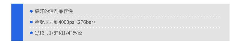 PEEK(聚醚醚酮)聚合物管對絕大多數(shù)化學(xué)溶劑惰性、具有生物容性等特點(diǎn),可替代不銹鋼管用于常規(guī)液體分析系統(tǒng)中。與不銹鋼管和鈦金屬管不同,PEEK管具有韌性、截取方便,PEEK管能使用不銹鋼或聚合物接頭。
