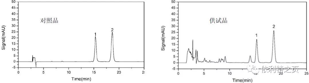 1.對(duì)照品溶液的制備:取黃芩苷對(duì)照品和鹽酸小檗堿對(duì)照品適量,精密稱定,加70%乙醇制成每1mL含黃芩苷40μg、鹽酸小檗堿20μg的混合溶液,即得。