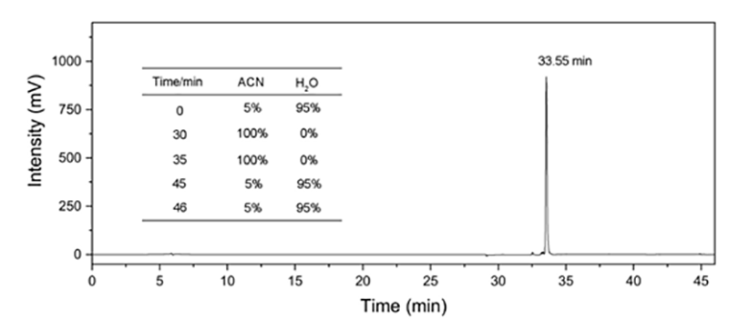 通過依利特EClassical 3140液相色譜儀搭配經(jīng)典SinoChrom ODS-BP色譜柱,對FmoccFFRRR肽的純度檢測,結(jié)果顯示,F(xiàn)moccFFRRR肽的純度為97.3%。