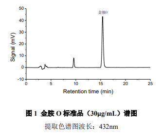 按照《中藥材及中藥飲片藥品檢驗(yàn)補(bǔ)充檢驗(yàn)方法和檢驗(yàn)項(xiàng)目批準(zhǔn)件》食藥監(jiān)稽函 [2012] 200 號文件中金胺 O 檢測方法,使用大連依利特分析儀器有限公司配置 DAD230 + 二極管陣列檢測器的高效液相色譜儀可以分析檢測中藥材和中藥飲片中的金胺 O,系統(tǒng)穩(wěn)定重復(fù),線性相關(guān)性良好,檢出限低,通過光譜圖比對、峰純度計(jì)算功能,能夠準(zhǔn)確定性,避免假陽性現(xiàn)象,滿足藥監(jiān)部門制定的標(biāo)準(zhǔn)要求。