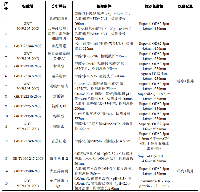 4.1 保健品中常見分析物質(zhì)的色譜柱推薦及儀器配置 ......................... 14