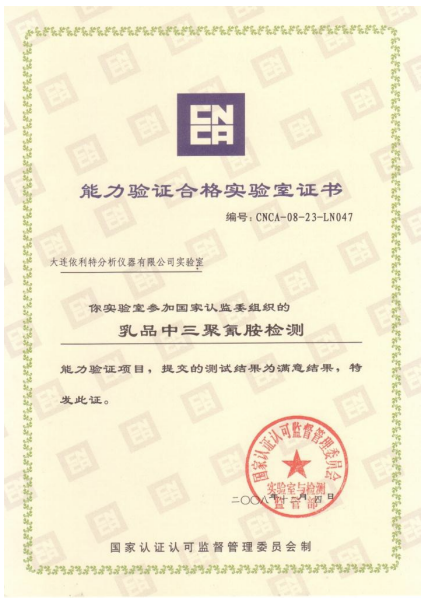 大連依利特分析儀器有限公司作為國(guó)內(nèi)知名廠家,秉承著 “質(zhì)量更佳、服務(wù)更優(yōu)、創(chuàng)新更快” 的理念,二十年來(lái)為食品安全、藥品檢測(cè)及高校應(yīng)用等眾多行業(yè)提供著完善的分析方法及先進(jìn)的儀器配置。從蘇丹紅、孔雀石綠到 “三鹿奶粉三聚氰胺” 事件,關(guān)系著國(guó)計(jì)民生的 “食品安全” 問(wèn)題一次次為我們敲響警鐘,并引起社會(huì)廣泛關(guān)注。針對(duì) “三聚氰胺” 事件,依利特人在第一時(shí)間做出反應(yīng),榮獲由國(guó)家認(rèn)證認(rèn)可監(jiān)督管理委員會(huì)頒發(fā)的 “能力驗(yàn)證合格實(shí)驗(yàn)室證書”,并且按照 GB/T 22388-2008《原料乳與乳制品中三聚氰胺檢測(cè)方法》、GB/T 22400-2008《原料乳中三聚氰胺快速檢測(cè) 液相色譜法》的國(guó)家標(biāo)準(zhǔn),在經(jīng)過(guò)大量實(shí)驗(yàn)驗(yàn)證后,提供出符合國(guó)標(biāo)的三聚氰胺檢測(cè)解決方案,包括分析方法驗(yàn)證及推薦儀器配置在內(nèi)的全套解決方案。