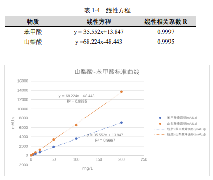 由表 1-4 可知,按照本解決方案提供的儀器及檢測方法進行分析,苯甲酸和山梨酸在 2-200mg/L 的濃度范圍內,線性良好,相關系數(shù)在 0.999 以上。