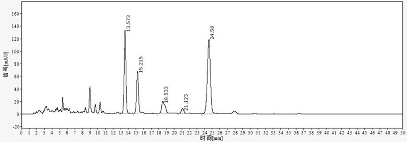 丹參大家都很熟悉,但是丹參酮可能就有些陌生。其實(shí)丹參酮就是從中藥丹參中提取的有效成分,是一類(lèi)菲醌化合物,包括隱丹參酮、丹參酮IA、丹參酮ⅡA等單體,主要具有抑菌、消炎、降溫的功效,而丹參酮ⅡA的磺化產(chǎn)物丹參酮ⅡA磺酸鈉,經(jīng)臨床試用證明治療心絞痛效果顯著,副作用小,為一治療冠心病的新藥。依利特使用EClassical 3200高效液相色譜儀匹配經(jīng)典的Supersil ODS2 色譜柱,對(duì)丹參酮進(jìn)行分析檢測(cè)。